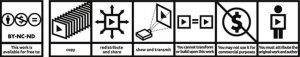 Attribution-NonCommercial-NoDerivs 4.0 – This licence is the most restrictive of our six main licences, only allowing others to download your works and share them with others as long as they credit you, but they can’t change them in any way or use them commercially. http://creativecommons.org/licenses/by-nc-nd/4.0/